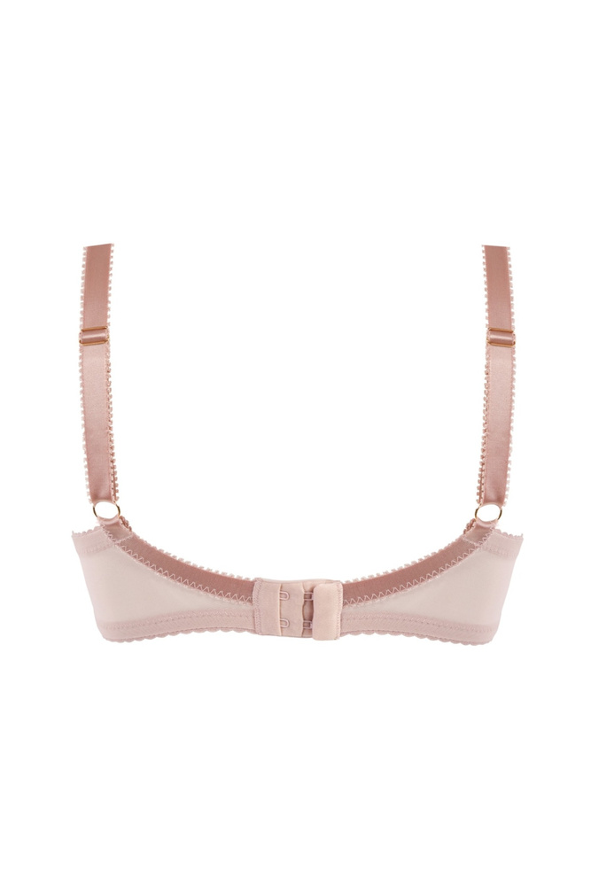 Polovyztužená konstrukce kombinuje lehce zpevněnou spodní část košíčku s jemnou krajkou a transparentní síťovinou v horní části. Díky tomu jsou prsa dobře stažena a nadzvednuta, zatímco horní část se přizpůsobuje jejich tvaru a neodstává. Květinová krajka v pudrovém odstínu dodává modelu jemnost a ženskost, zatímco ozdobný detail mezi košíčky podtrhuje elegantní vzhled.