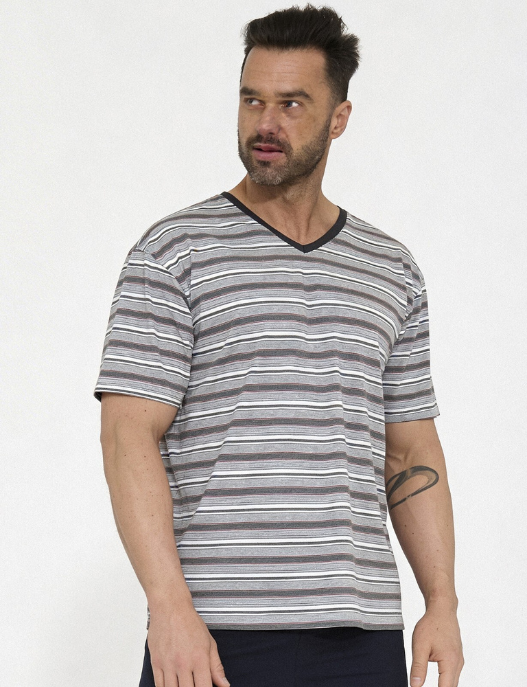Tričko s krátkým rukávem v proužkovaném designu je vyrobeno ze směsi 80 % bavlny a 20 % polyesteru. Díky tomu je materiál příjemně měkký na dotek, zároveň si však lépe drží tvar i barvu po opakovaném praní. Výstřih do V usnadňuje oblékání a působí upraveně na různých typech postavy. Jednobarevné kraťasy ze 100% bavlny jsou lehké, vzdušné a vhodné i pro citlivější pokožku. Elastický pas je potažen bavlnou, což zvyšuje pohodlí a omezuje nepříjemný tlak během spánku.