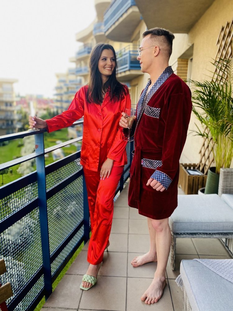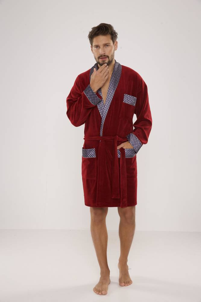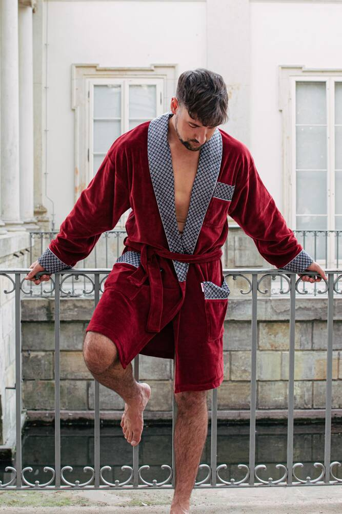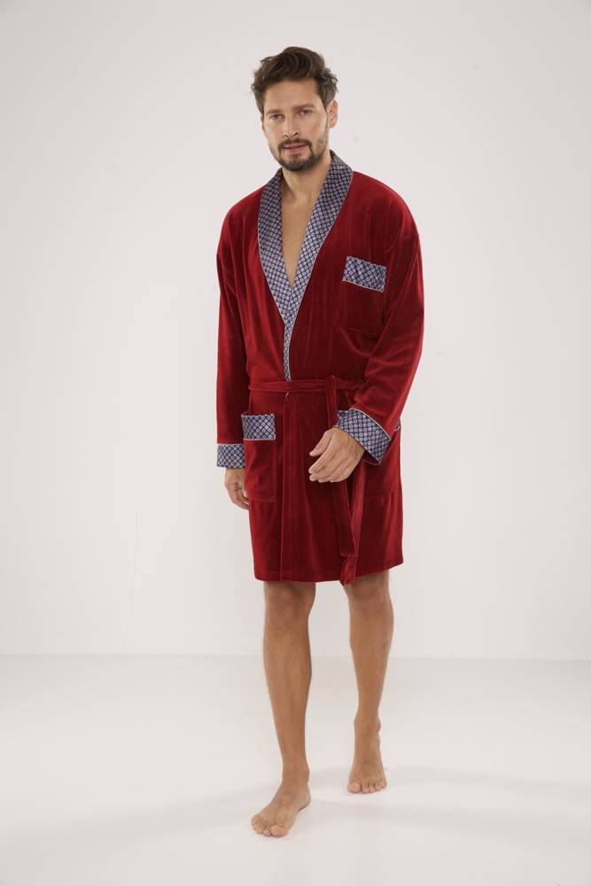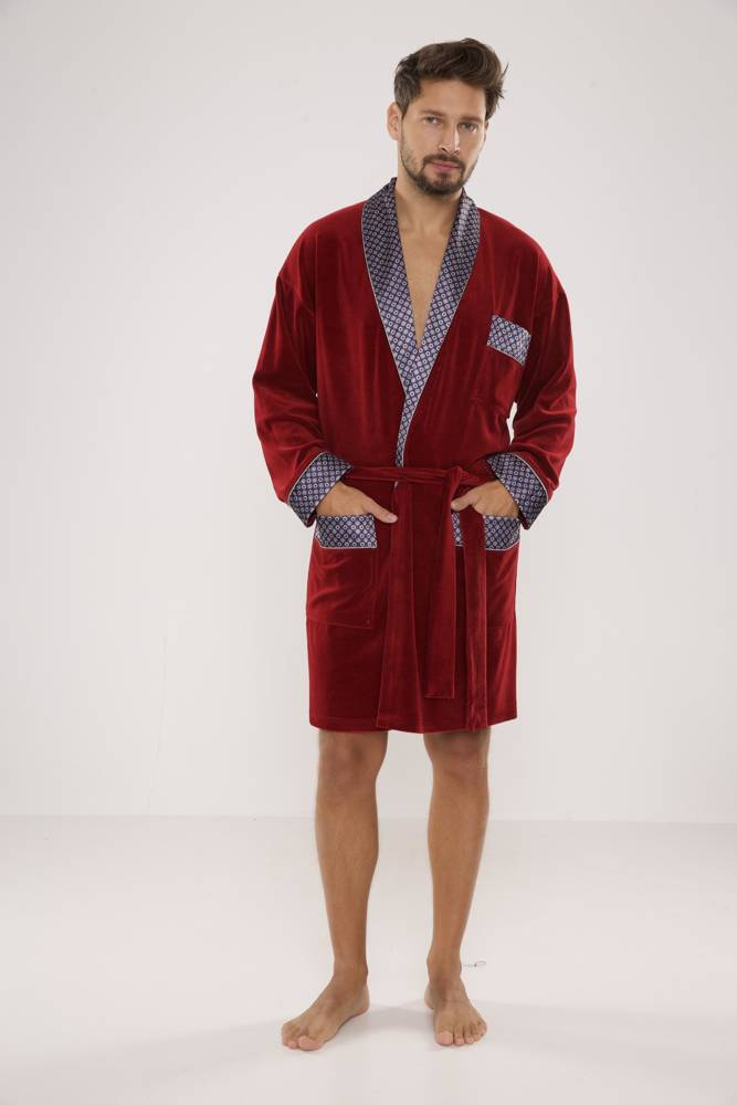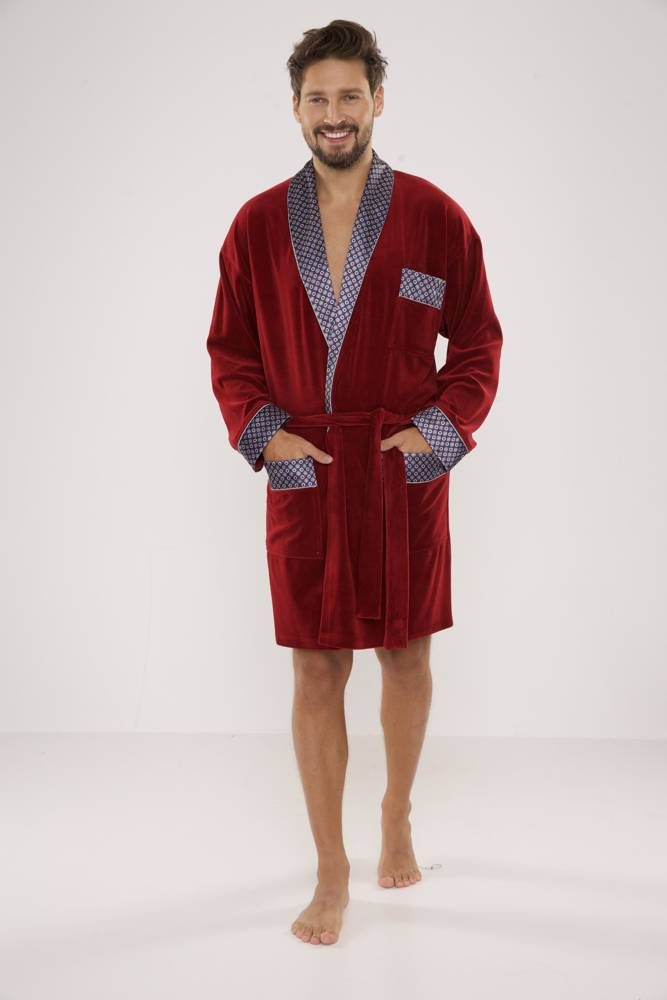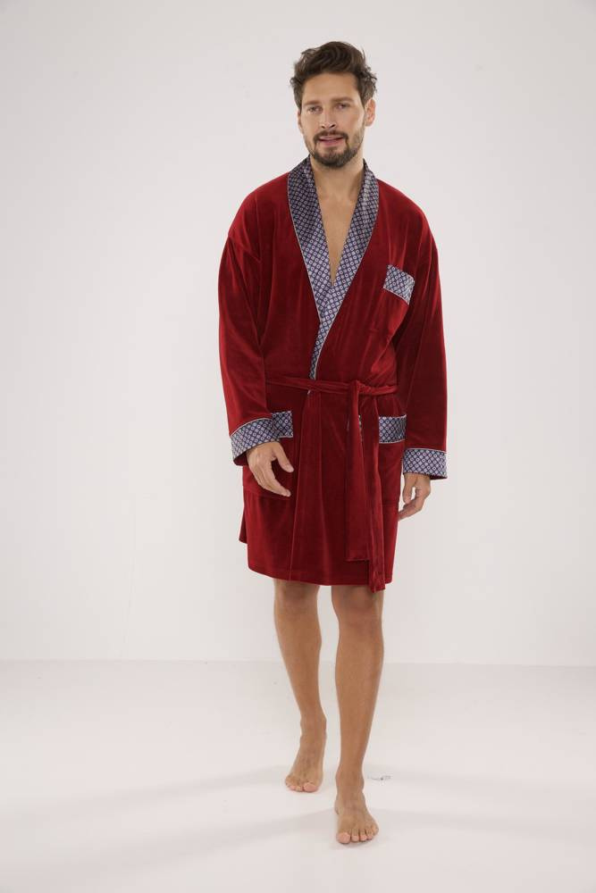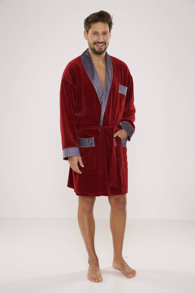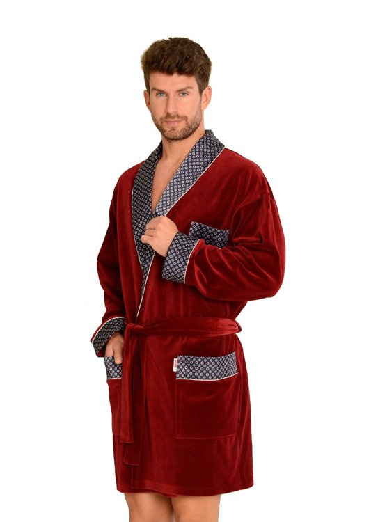 Krátký pánský velurový župan s šálovým límcem, zavazováním v pase, se dvěma kapsami a jednou menší kapsou na hrudi. Manžety, límec a kapsy jsou zakončeny vzorovaným saténem. Je vyroben z 80 % bavlny příjemné na dotek s dokonalou absorpcí vody.