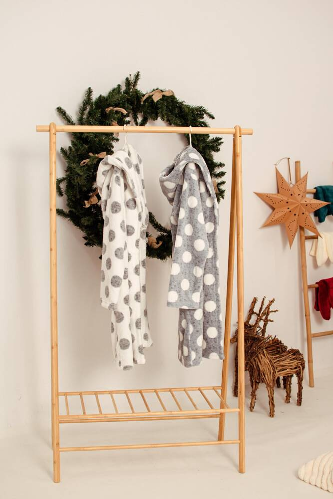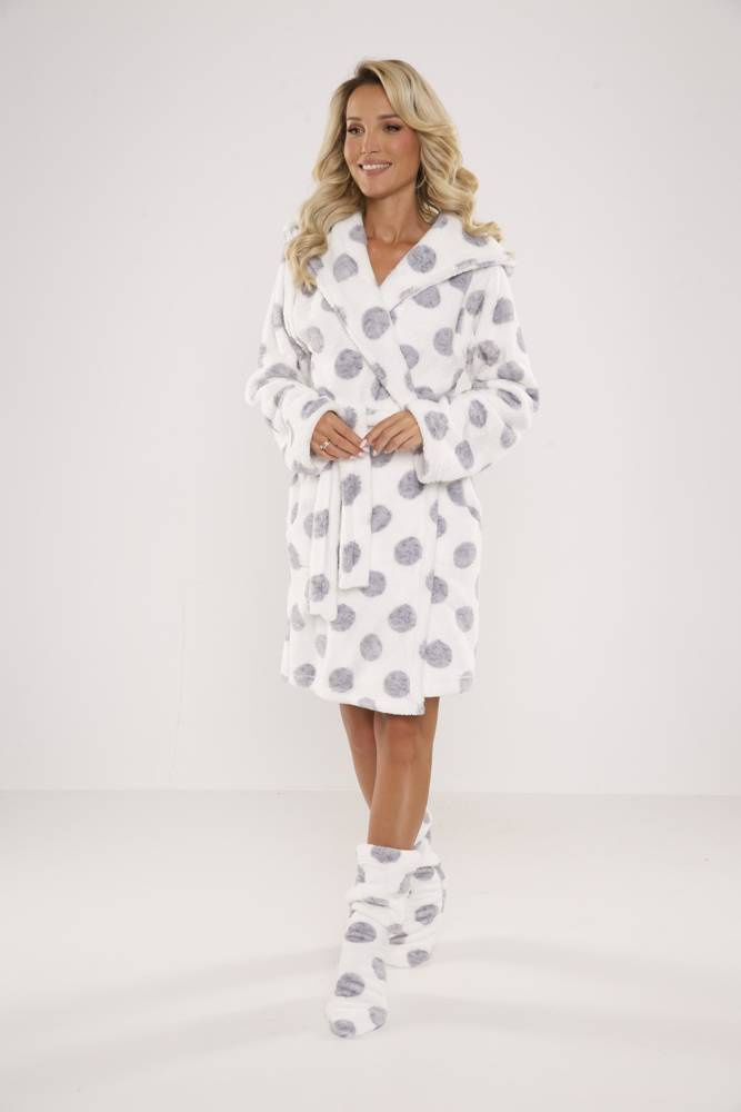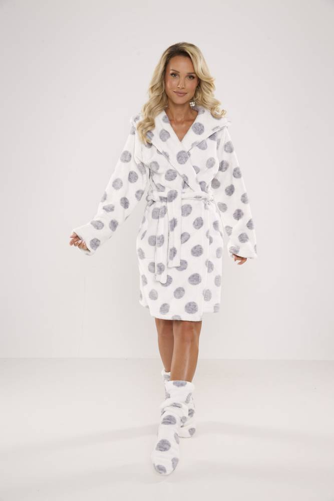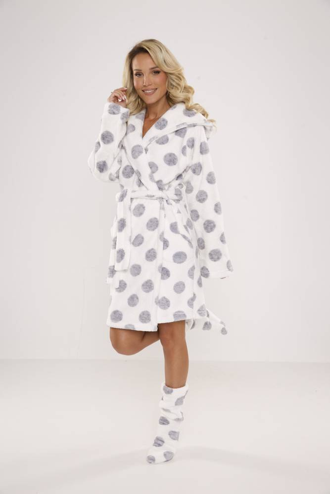 Dámský krátký župan s kapucí z měkkého úpletu s velkými puntíky. Zavazování v pase, s kapsami. Hlavní výhodou tohoto modelu je hřejivá a na dotek příjemná plyšová tkanina. JE TO VYSOCE KVALITNÍ VÝROBEK S VELMI DOBROU ABSORPCÍ VODY !!!