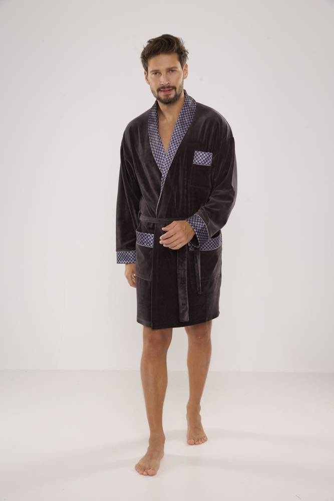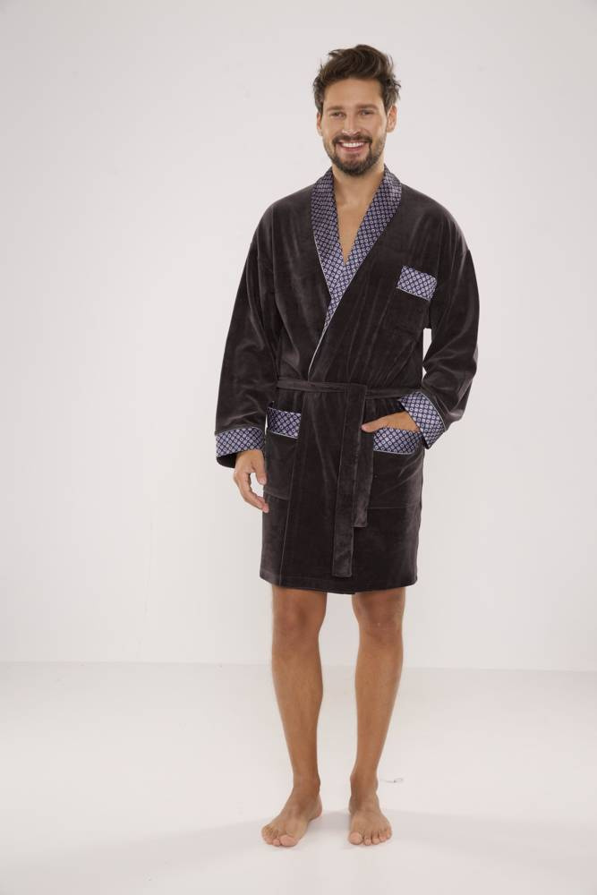 Krátký pánský velurový župan s šálovým límcem, zavazováním v pase, se dvěma kapsami a jednou menší kapsou na hrudi. Manžety, límec a kapsy jsou zakončeny vzorovaným saténem. Je vyroben z 80 % bavlny příjemné na dotek s dokonalou absorpcí vody.