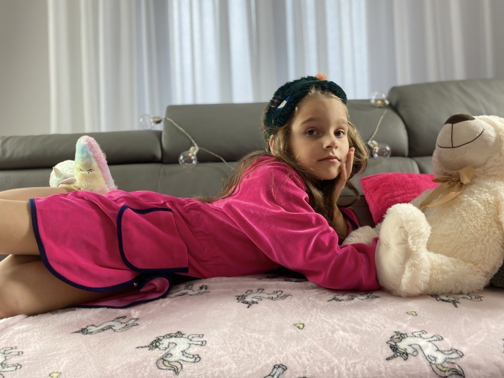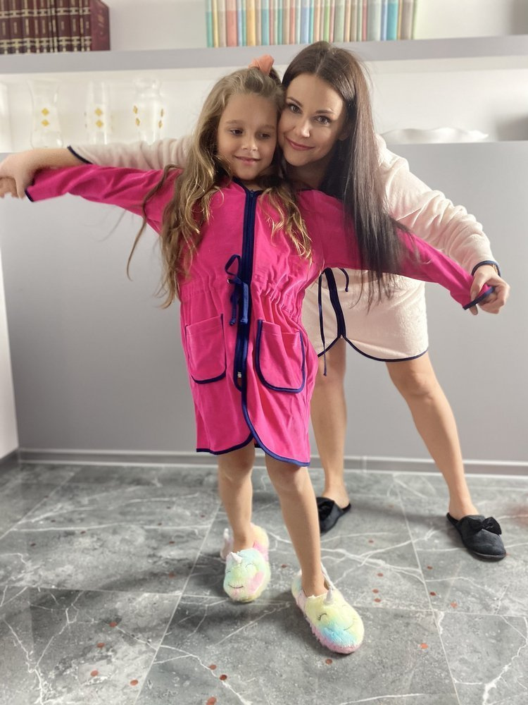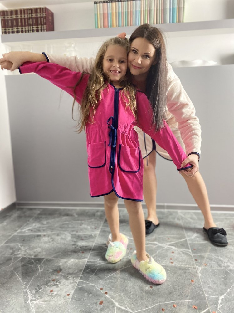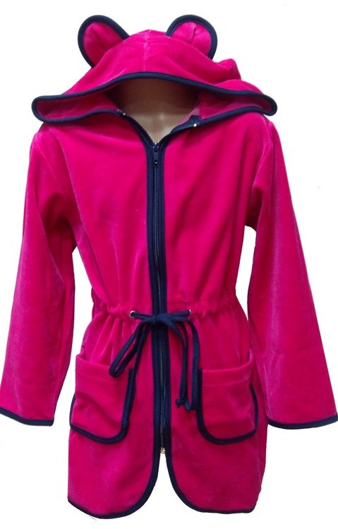 Krátký župan dětská bunda s kapucí a zipem. Vyrobeno z veluru. Nastavitelné popruhy v pase. Model zdobený ušima na kapotě. Župan se dokonale přizpůsobí tvaru těla, je mimořádně měkký a lehký. Zabalit se do něj po koupeli je potěšení!