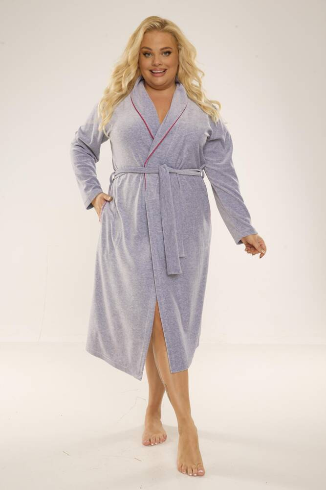 Dlouhý pohodlný dámský župan se šálovým límcem. Vyrobeno z příjemného veluru, který je příjemný na tělo. Zavazování v pase, s kapsami. Ozdobené lemováním v kontrastní barvě.