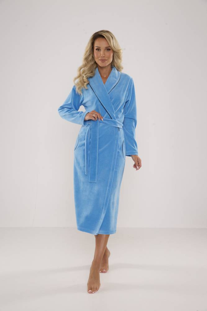 Dlouhý pohodlný dámský župan se šálovým límcem. Vyrobeno z příjemného veluru, který je příjemný na tělo. Zavazování v pase, s kapsami. Ozdobené lemováním v kontrastní barvě.