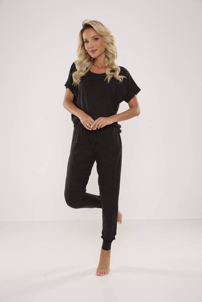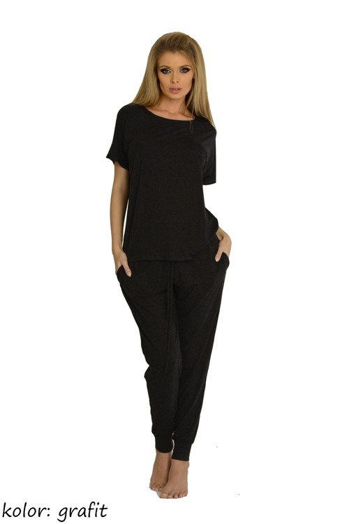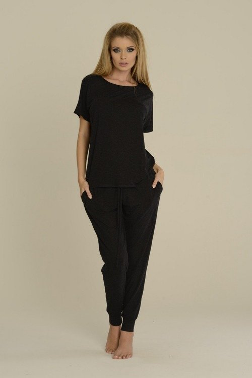 Dámské pyžamo z vysoce kvalitní viskózy s elastanem. Volné tričko s krátkými reglánovými rukávy. Dlouhé kalhoty s kapsami, nohavice zakončené šňůrkou.
