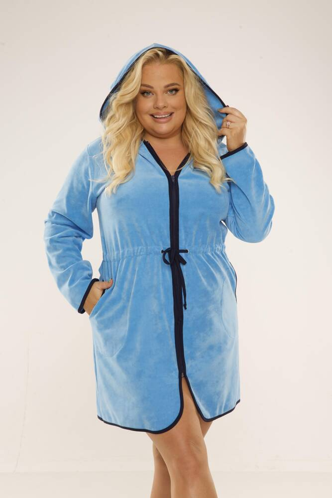 Dámský krátký župan s kapucí, zapínání na zip. Vyrobeno z veluru. Nastavitelné popruhy v pase. Župan se dokonale přizpůsobí tvaru těla, je mimořádně měkký a lehký. Zabalit se do něj po koupeli je potěšení!