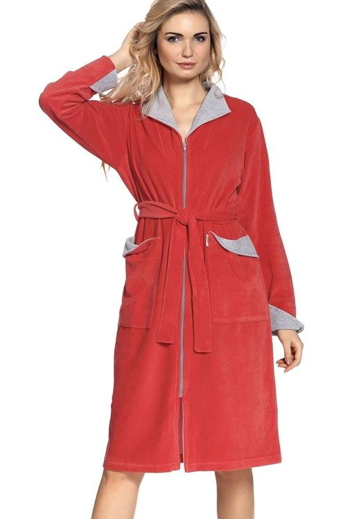 Dámský dlouhý župan z veluru, zapínaný na zip, s výrazným límcem. Kapsy na bocích. Límec, manžety a lemy kapes v kontrastní barvě.