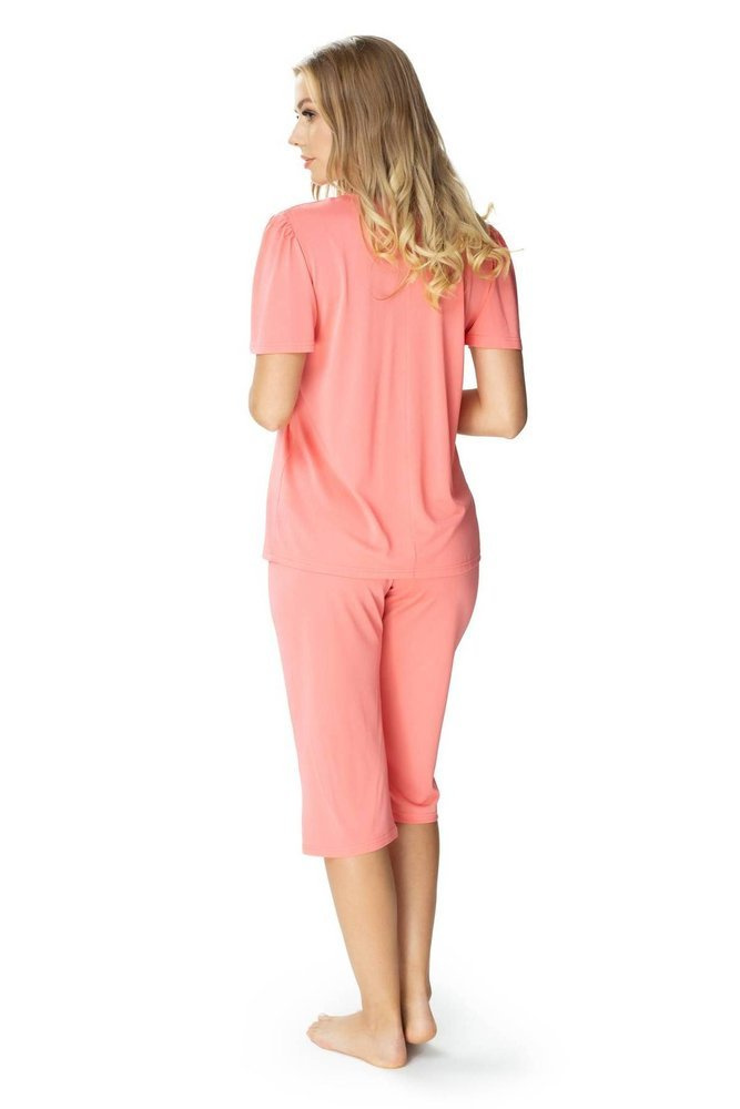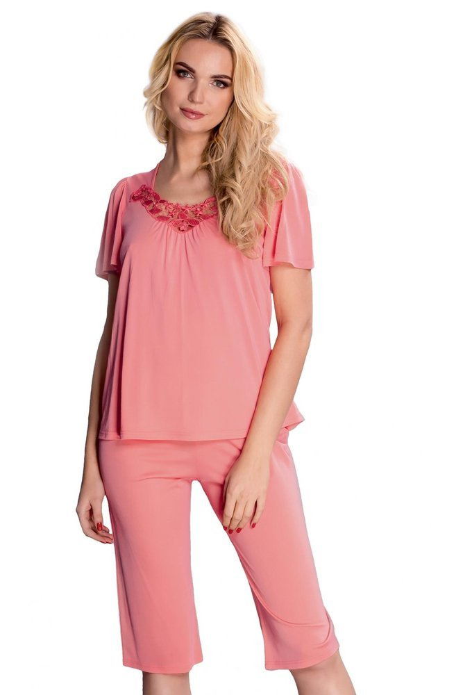 Elegancja i gwarancja wyjątkowego komfortu noszenia - zapewnia odprężający sen i rozpieszcza skórę najwyższą jakością. Wykonana z przyjaznej ciału wiskozy. Piżama o wygodnym, luźnym kroju. Górna część z krótkim, szerokim rękawem, okrągłym - obszytym gipiurową koronką - dekoltem oraz lekkim marszczeniem w środkowej części. Spodnie typu rybaczki na cienkiej, wszywanej gumie.