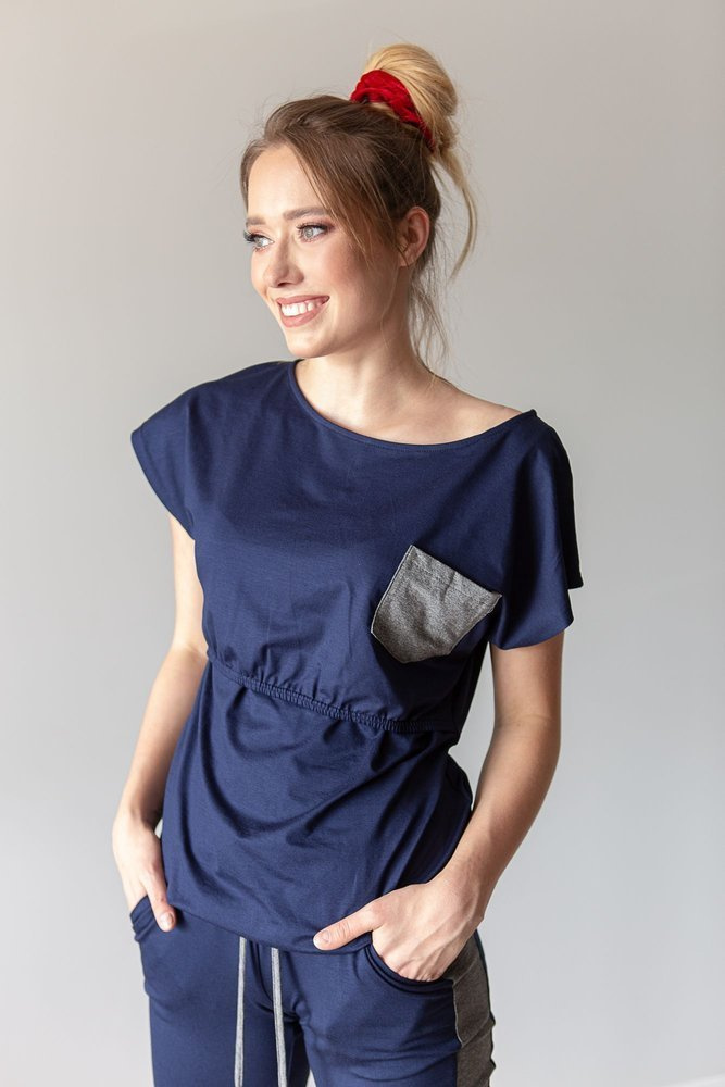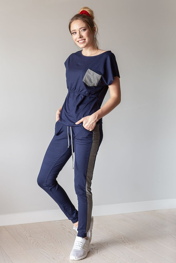 .Komplet dresowy z krótkim rękawem wykonany z wysokiej jakości dzianiny.Idealny zestaw dla przyszłych i obecnych mam. Klasyczny a jednak stworzony specjalnie z myślą o mamach komplet dresowy to połączenie wygodnych spodni z wysokim pasem z bluzą, która dzięki odciętej górze pozwoli wygodnie nakarmić malucha.