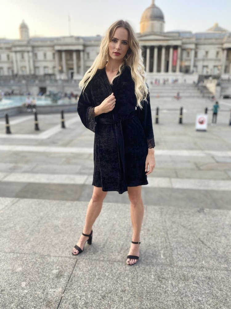 Dámský župan z kvalitního bambusového veluru. Krátké, zavazování v pase, 3/4 rukávy. Manžety jsou zdobené výraznou květinovou krajkou. Župan se dokonale přizpůsobí tvaru těla, je mimořádně měkký a lehký. Zabalit se do něj po koupeli je potěšení!