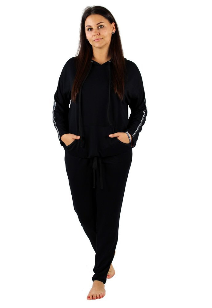 Pohodlná dámská tepláková souprava z materiálu příjemného na tělo. Mikina s dlouhým rukávem a kapucí. Na úrovni břicha, kapsa. Kalhoty s kapsami. Opasek zakončený stahovací šňůrkou. Rukávy a nohavice zdobené nápisy.