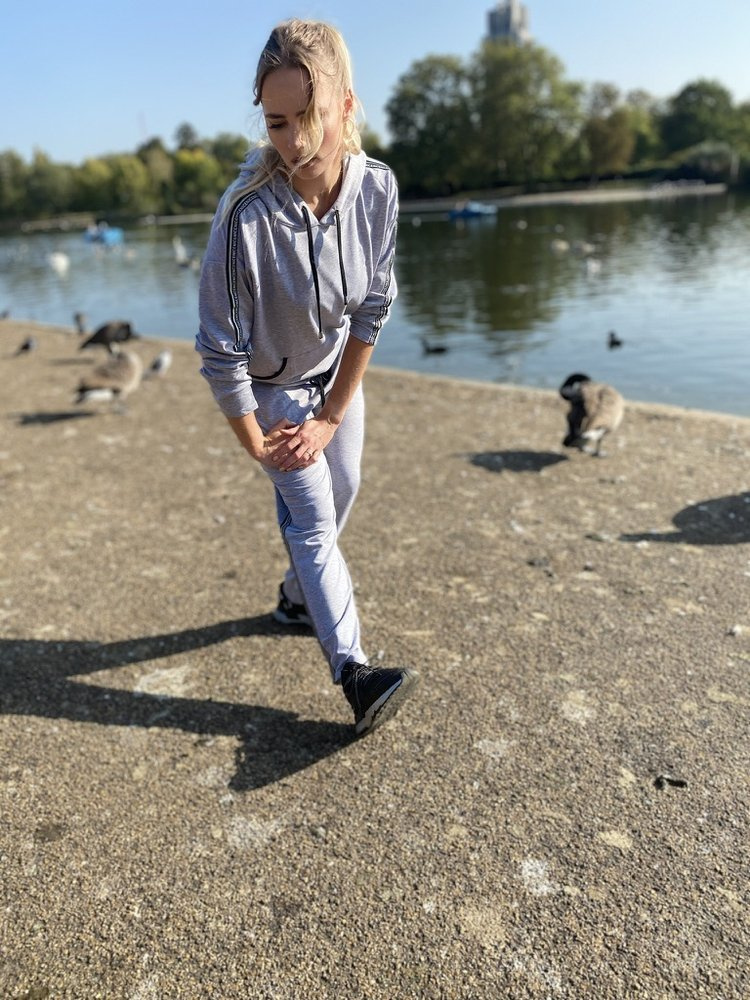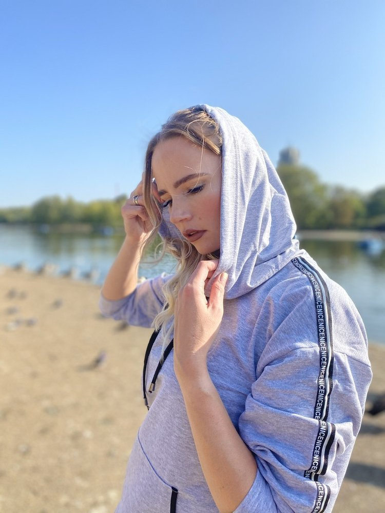 Pohodlná dámská tepláková souprava z materiálu příjemného na tělo. Mikina s dlouhým rukávem a kapucí. Na úrovni břicha, kapsa. Kalhoty s kapsami. Opasek zakončený stahovací šňůrkou. Rukávy a nohavice zdobené nápisy.