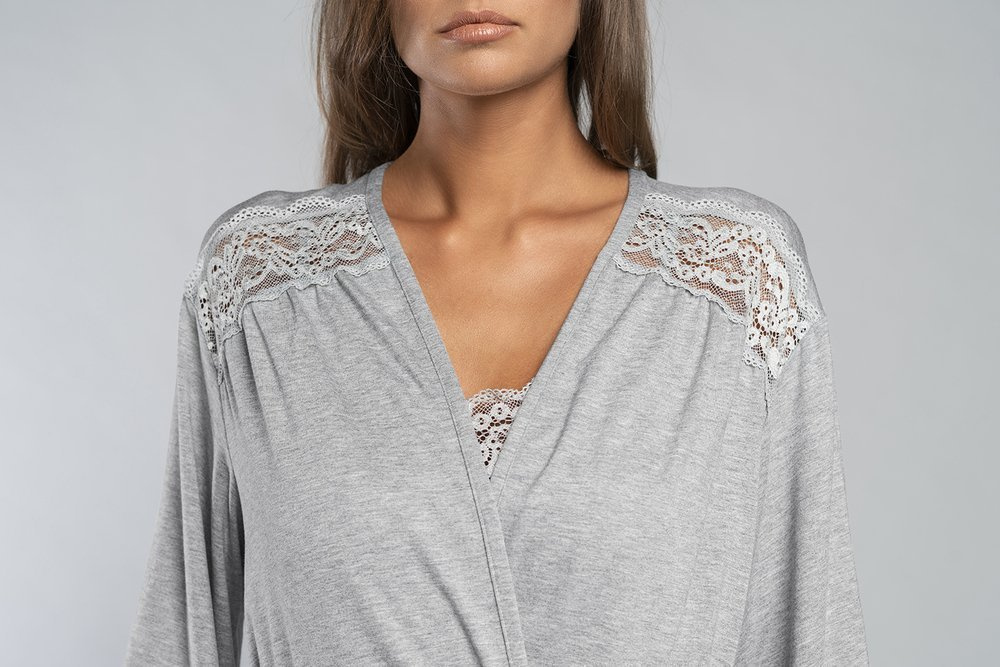 Model má kapsy na bocích a pohodlné zavazování v pase. Zdobené jemnou krajkou na rukávy, oras výstřihem.