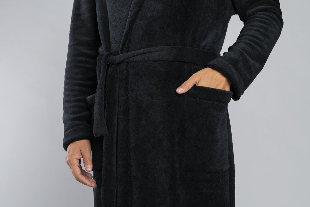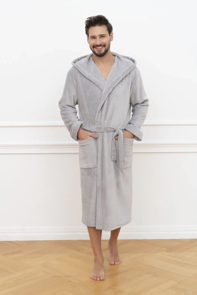 Long pánský župan s kapucí, vázaný v pase.