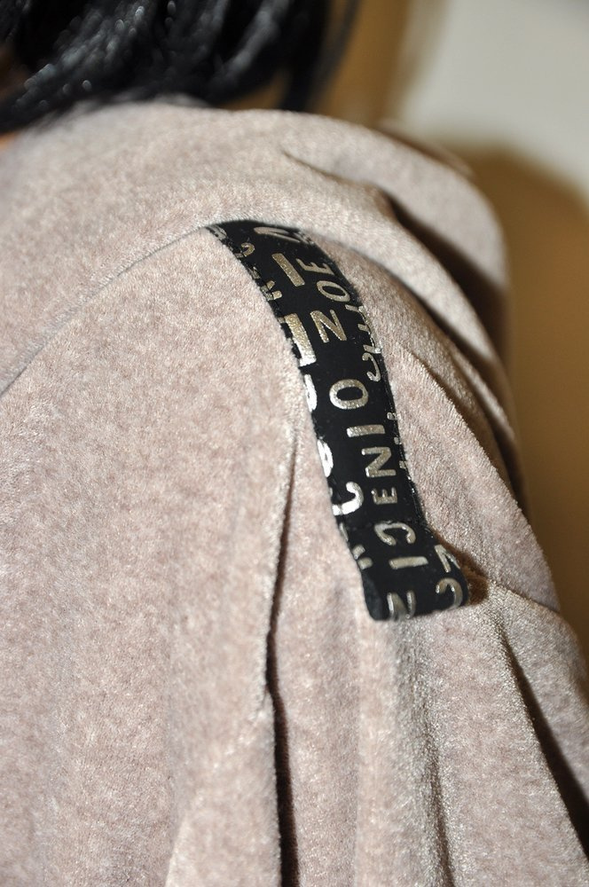 Dámský krátký župan s kapucí, melanžový velur. Pohodlné kapsy na úrovni boků, elastický pas na zádech. Trvale všitý popruh. Ramena a pas s černým lemováním s lesklým nápisem. Župan se dokonale přizpůsobí tvaru těla, je mimořádně měkký a lehký. Zabalit se do něj po koupeli je potěšení!