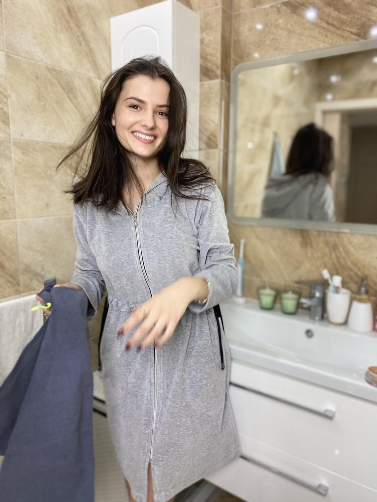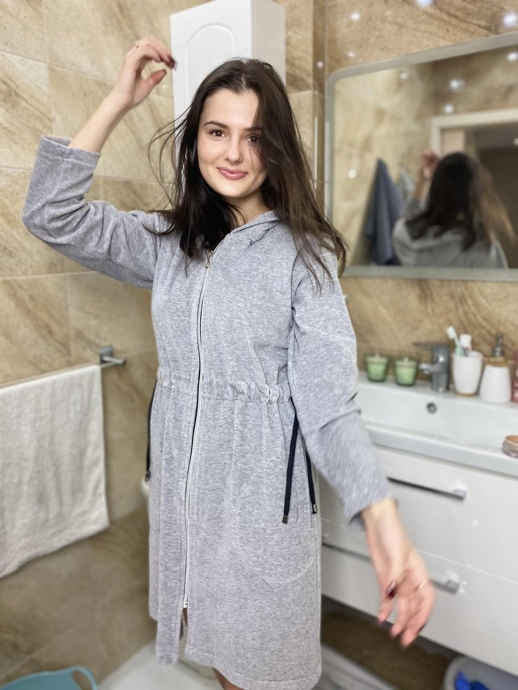 Dámský župan z příjemného veluru, s kapucí. Zip, dlouhé rukávy, pohodlné kapsy na úrovni boků. Na bocích jsou černé kravaty, které zvýrazňují linii pasu. Župan se dokonale přizpůsobí tvaru těla, je mimořádně měkký a lehký. Zabalit se do něj po koupeli je potěšení!