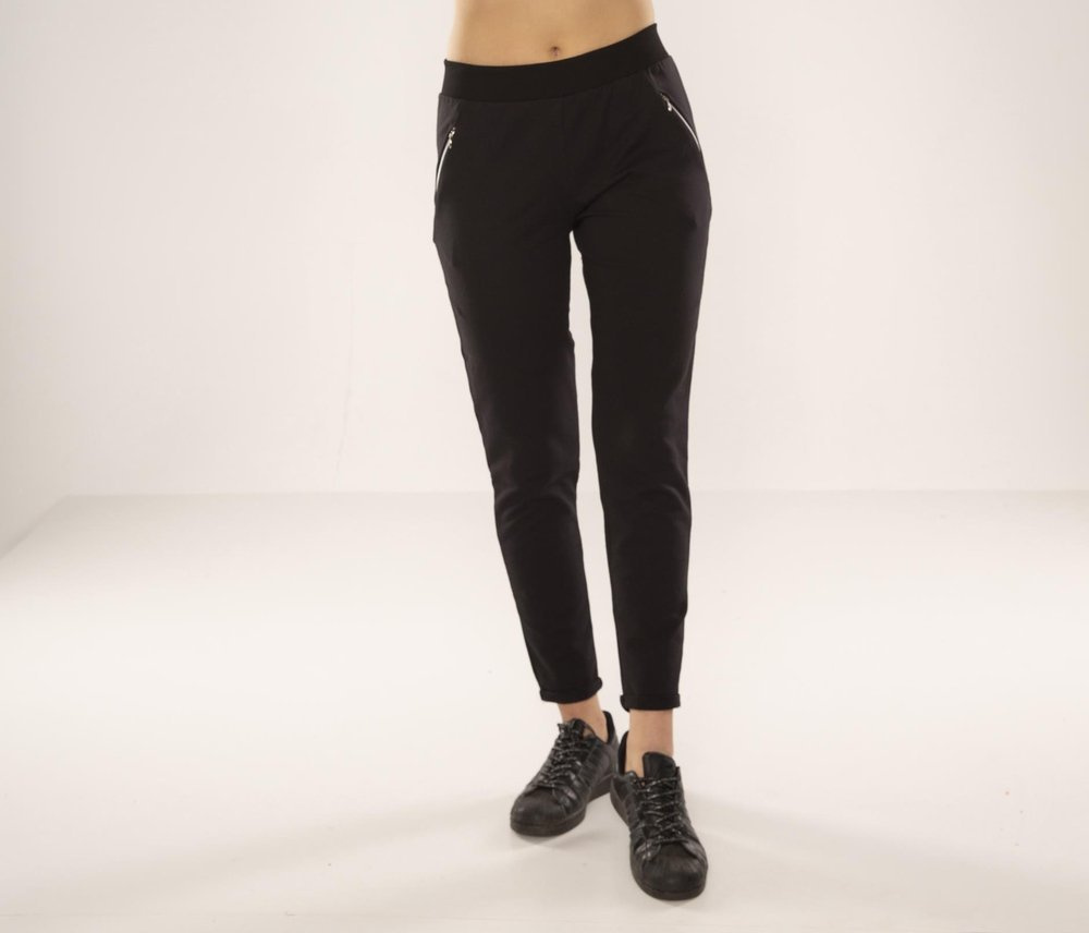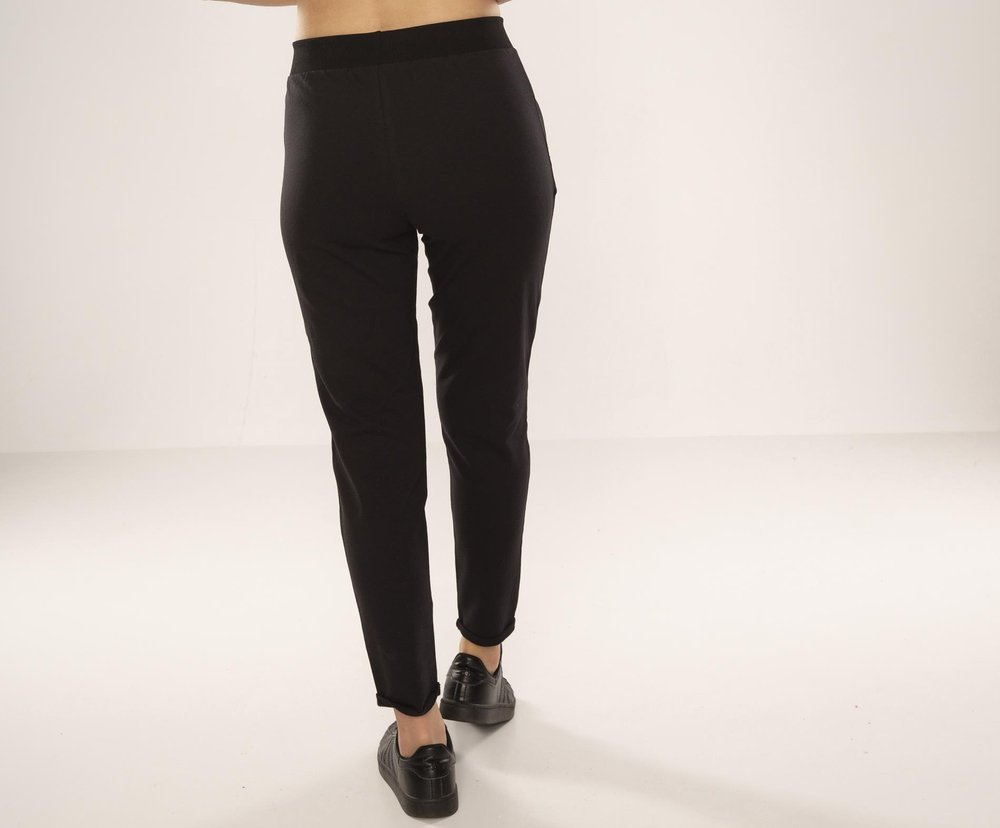 Tepláky z vysoce kvalitní bavlny. Pohodlné stahování v pase. Kapsy na zip na úrovni boků. Mírně zúžené nohavice zakončené malou manžetou.
