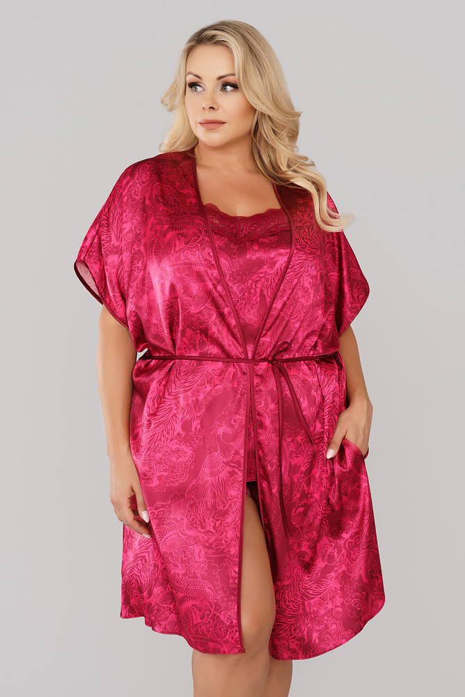 Saténový župan Impresja je zárukou třídy a elegance. Intenzivní barva červeného vína a orientální motivy jsou ideální pro večerní rande s vaší milovanou osobou. Přední zavazování a hluboký výstřih do V krásně zvýrazní a podtrhne vaši siluetu. S pyžamem nebo košilí Impresja si můžete vytvořit jedinečný a nezapomenutelný komplet.