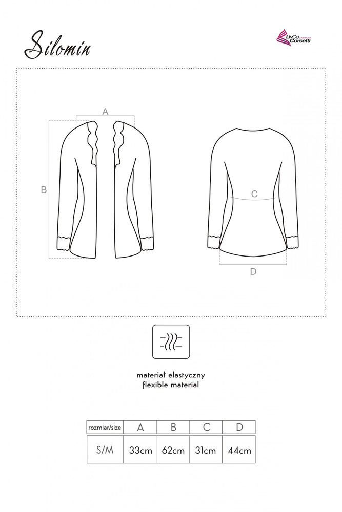 Fascinující souprava spodního prádla z jemné černé krajky. Krátký župan a body s nastavitelnými ramínky. Horní část a dlouhé rukávy županu zdobené černou krajkou. Podprsenka má svislé rozparky. Zadní díl je ve spodní části zdobený krajkou, která svůdně odhaluje záda.