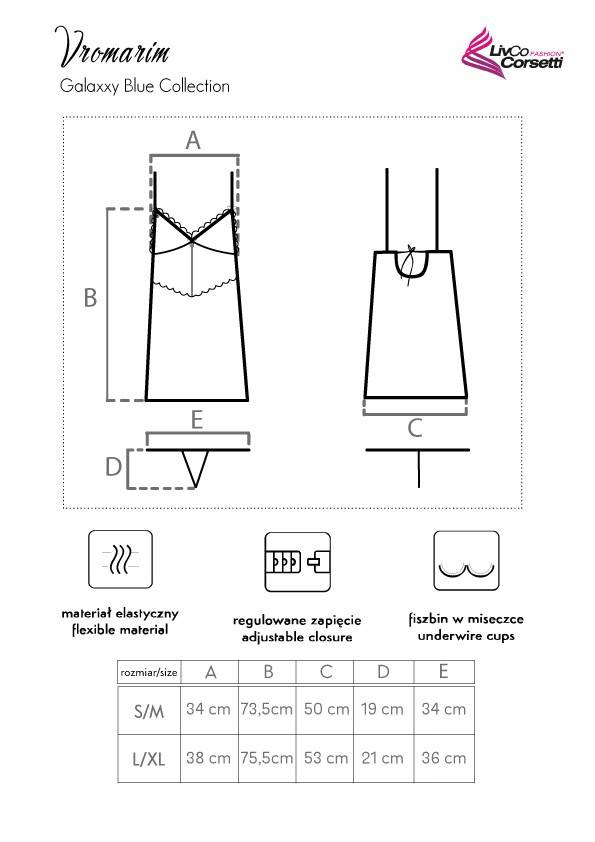 Tričko je vyrobeno z hladké, splývavé látky v tmavě modré barvě, která jemně zvýrazňuje křivky ženského těla. Je pohodlný a pružný, dobře sedí na každé postavě. Pod poprsím je našita jemná krajka v barvě ecru, která zdobí i horní část košilky ve výstřihu. Světlá krajka kontrastuje s výraznou tmavě modrou barvou zbytku látky, což působí velmi zajímavě. Uprostřed, pod výstřihem, je malá saténová mašlička, která dodává celku krásný vzhled. Košilka sahá do půli stehen a má tenká, jemná ramínka, takže vypadá velmi smyslně. Délku ramínek lze upravit podle potřeby, aby se přizpůsobila vaší postavě. Vzadu, v horní části zad, je svázán silnou stuhou z dominantní tmavě modré látky. V takovém nočním prádle se každá žena bude cítit krásná a přitažlivá.