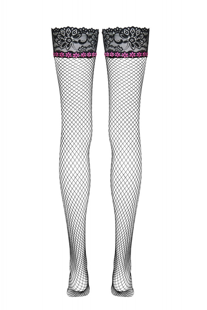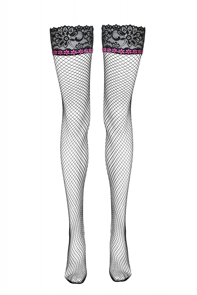 Klasický černý kabaret, opaskový model. Horní část punčoch zdobená elegantní ažurovou krajkou a aplikací růžových květů.