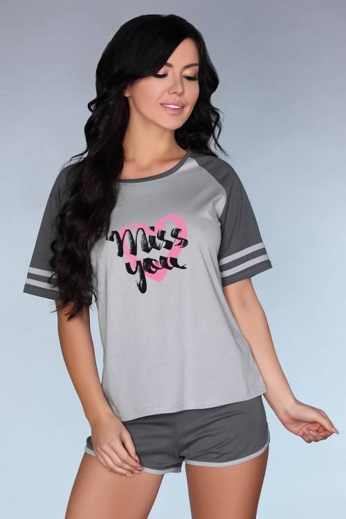 Velmi pohodlné bavlněné pyžamo sestávající z krátkých tmavě šedých šortek lemovaných dole světlejším lemováním a popelavé tmavé košile s krátkým rukávem a lemováním. Tričko má navíc černý nápis na růžovém srdci.
