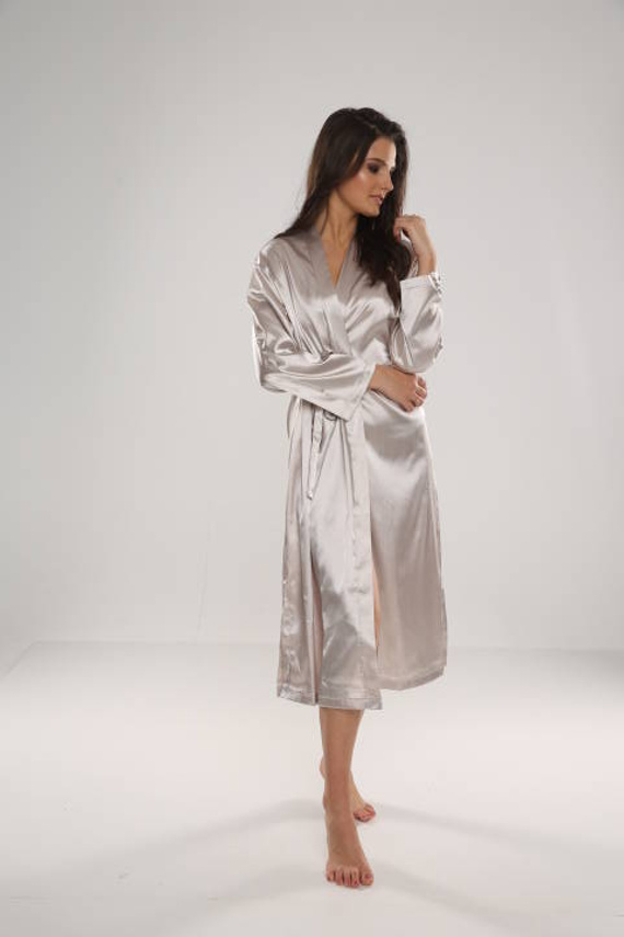 Tento župan ze splývavého saténu a pohodlného střihu je nezbytnou součástí elegantního dámského šatníku a uplatní se v každé situaci. Rukávy lze nosit dvěma způsoby: s ohrnutými manžetami nebo rovně. Záleží na tom, jakou máte náladu. Saténový podvazek je dodáván s páskem, který sexy zvýrazňuje pas.