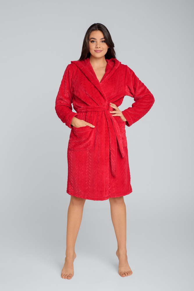 Extrémně hřejivý, měkký dámský župan Zala v krásném odstínu šťavnaté červené je ideální volbou pro ženy, které v módě ocení styl, pohodlí a špetku bláznivosti. Model je vyroben z vysoce kvalitního, na dotek příjemného bi fleecového úpletu, který je zdoben jemným reliéfním kostkovaným vzorem. Župan má pohodlný, volný střih, dvě praktické kapsy, kapuci a zavazování v pase, které krásně zvýrazní ženskou siluetu.