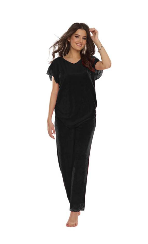 Dvoudílné pyžamo De lafense z vysoce kvalitního bambusu. Ideální pro dobrý spánek a skvělý start do nového dne s první ranní kávou. Volná halenka s krátkými rukávy, zdobená krajkou. Model ne omezuje se pohybuje a pěkně zvýrazňuje siluetu. Dlouhé pevné kalhoty s elastickým pasem. Pyžamo příjemné na dotek v zajímavých barvách.