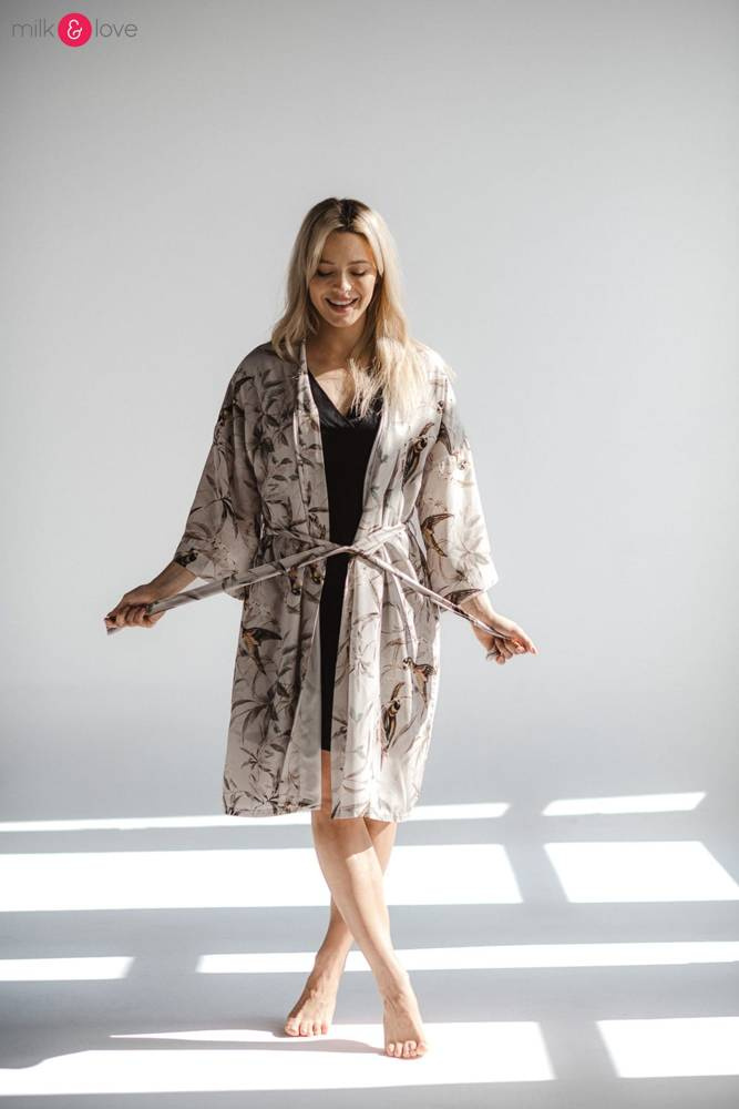 Szlafrok został zaprojektowany z myślą o mamach, dlatego jest nieco dłuższy, abyś spokojnie okryła nim ciążowy brzuszek. Po porodzie bez skrępowania b będziesz mogła spacerować po szpitalnym korytarzu lub na leżąco nakarmiła maluszka w połogu. Posiada kieszenie na niezbędne drobiazgi i pasek do regulowania szerokości.