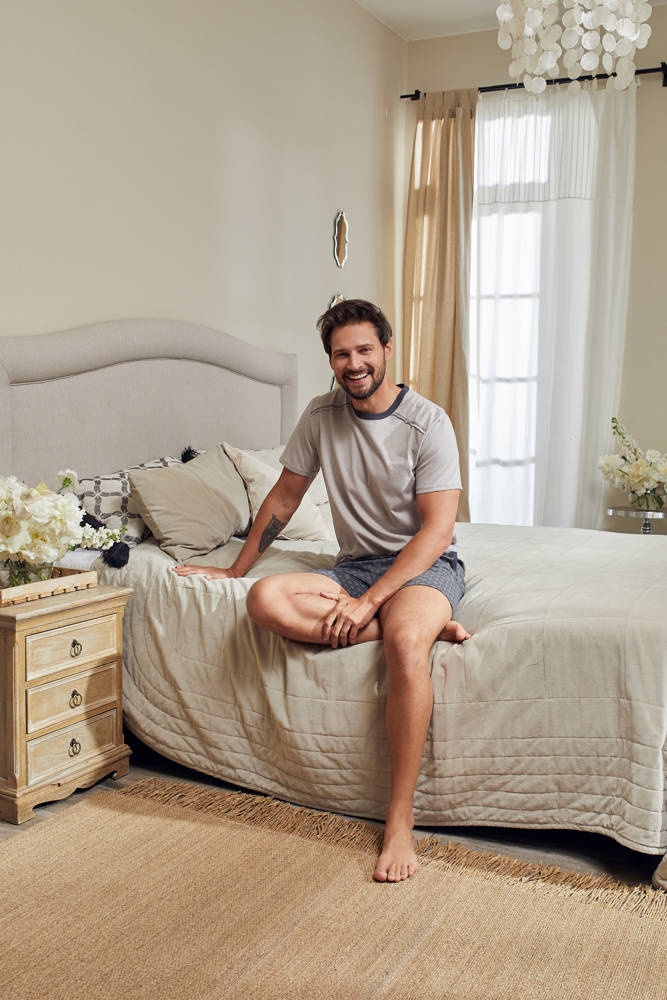 Univerzální pánské pyžamo, které zaujme svou jednoduchostí a minimalismem. Je to dokonalá kombinace klasických, klidných barev s nádechem šílenství v podobě kosočtvercového vzoru. Zajímavým prvkem je prošívání v kontrastních barvách, které dodává moderní nádech.