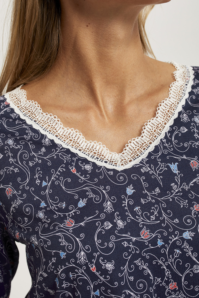 Dámské vzorované tričko s dlouhými rukávy. Krásný motiv na tmavém pozadí přitahuje pozornost a dodává košili šarm. Výstřih je lemován kontrastní krajkou. Celková délka košile sahá před kolena. Vysoce kvalitní jemná bavlna použitá k ušití trička je bezpečná a šetrná k pokožce. Dlouhá životnost je zajištěna kvalitou použité tkaniny a přesností šití.