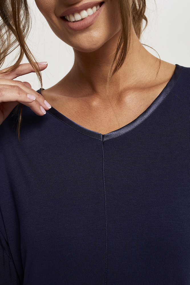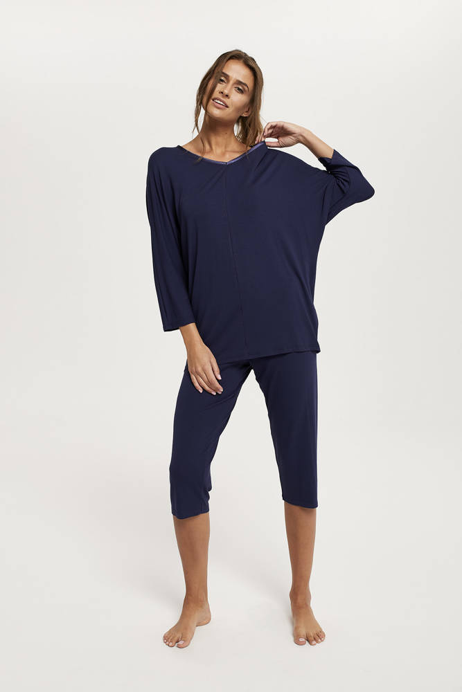 Měkké dámské pyžamo s 3/4 rukávy a nohavicemi. Vyrobeno z viskózy obohacené elastanem. K dispozici v tmavě modré barvě. Pyžama krásně prezentují ženskou siluetu a zdůrazňují její přednosti. Vrchní část pyžama je uprostřed předního dílu doplněna zajímavým prošitím a výstřih je zakončen tmavě modrým saténovým lemem, který dodává celkovému vzhledu elegantní nádech.