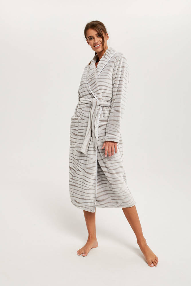 Župan Asma je měkký a příjemný na dotek, ideální pro podzimní a zimní období. Měkká a nadýchaná tkanina je bipolární, má vynikající tepelnou izolaci, která zaručuje teplo a pohodlí. Výrazný zvířecí potisk se skvěle snoubí s jemnou šedou barvou a dodává celku jedinečný charakter. . Další výhodou je praktické zavazování v pase a funkční kapsy.