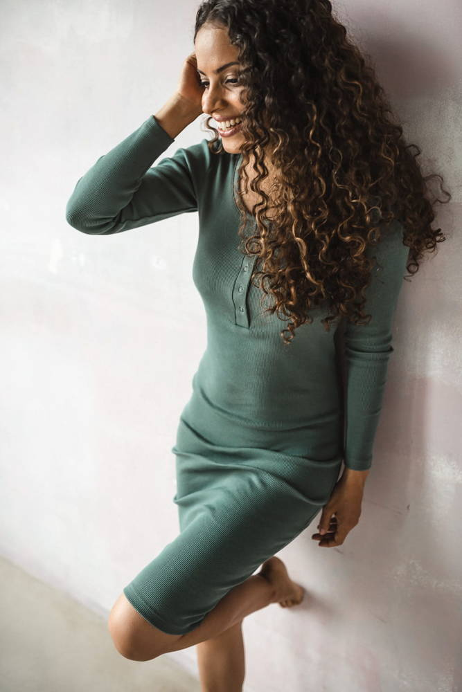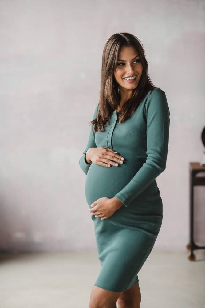 Wygodna sukienka ciążowa uszyta z wysokiej jakości dzianiny, która się nie odkształca! Ma dopasowany krój, a dzięki napom przy dekolcie swobodnie nakarmisz w niej maluszka. Można ją nosić także po ciąży, jako zwykłą sukienkę typu bodycon! Idealna na co dzień i na specjalne okazje Została uszyta z miękkiej dzianiny, która przeszła rygorystyczne testy Oeko-Tex Standard 100. Bawełniana dzianina zachowuje gładkość i  głęboki kolor nawet po wielu praniach. Uszyta w Polsce!