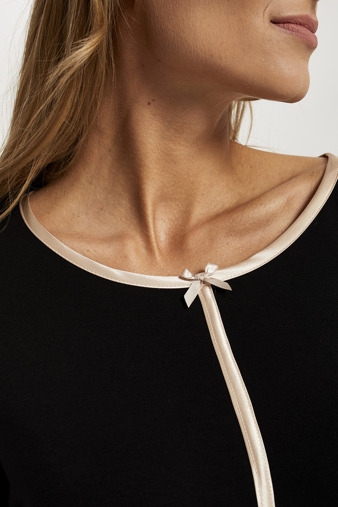 Dámské pyžamo s dlouhými rukávy a dlouhými nohavicemi, které je ženské a zároveň funkční. Pyžamo má kulatý výstřih a kontrastní saténové lemování uprostřed. U krku je halenka zakončena půvabnou mašlí. Dlouhé kalhoty zakončené dole gumou. Díky použití viskózy obohacené elastanem je toto pyžamo ideální pro chladnější večery.