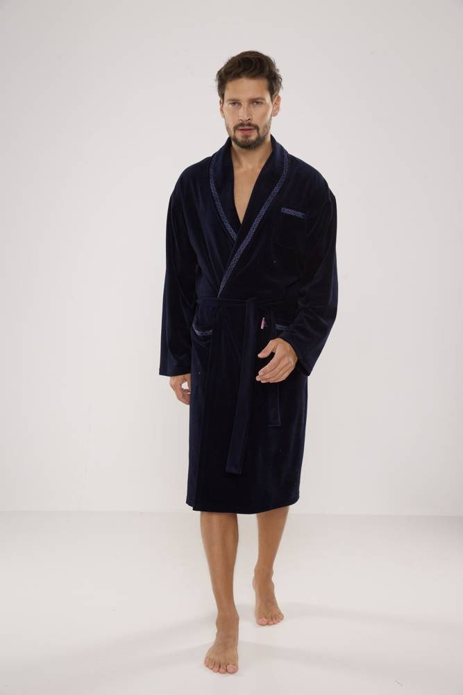 Pánský dlouhý velurový župan. Model s šálovým límcem, zavazováním v pase, dvěma kapsami na bocích a jednou na hrudi. Wz 80 % bavlněného veluru. Material příjemné s měkkým omakem a vynikající absorpcí vody.