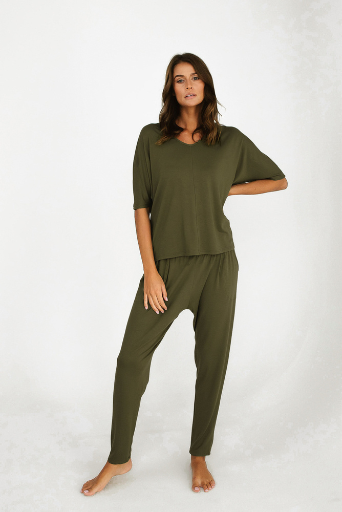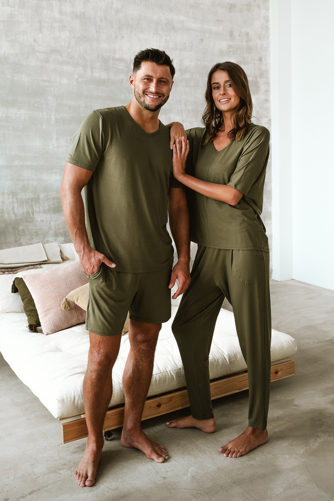 Kolekce PARAMO z viskózy je ideální pro všechna roční období. Jeho všestrannost je dána tlumenou khaki barvou a vysoce přizpůsobivým materiálem pro různé teploty. Viskóza chrání pokožku před chladem, ale struktura této tkaniny je prodyšná, takže účinně reguluje tělesnou teplotu. Měkká a na dotek velmi příjemná viskóza navíc poskytuje mimořádné pohodlí během spánku, kterého je dosaženo díky netlačící gumě v nohavicích a volnému střihu. Půvab sady dodává originální a lehce rozvolněný střih. Je ideální volbou pro ty, kteří dávají přednost pohodlí a třídě.