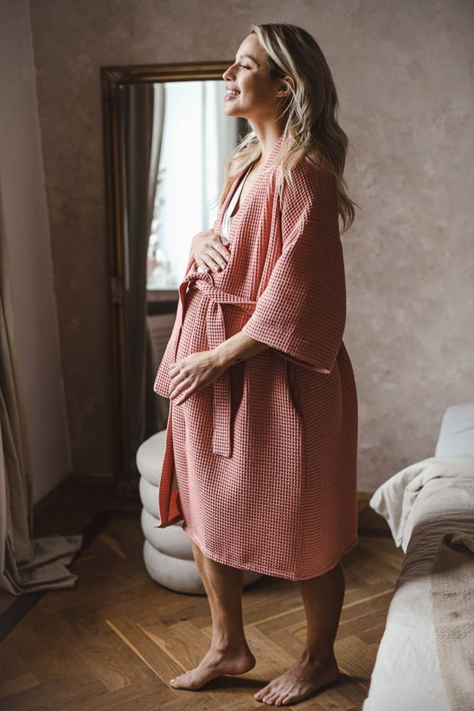 Szlafrok został zaprojektowany z myślą o mamach, dlatego jest nieco dłuższy, abyś spokojnie okryła nim ciążowy brzuszek. Po porodzie bez skrępowania b będziesz mogła spacerować po szpitalnym korytarzu lub na leżąco nakarmiła maluszka w połogu. Posiada kieszenie na niezbędne drobiazgi i pasek do regulowania szerokości.