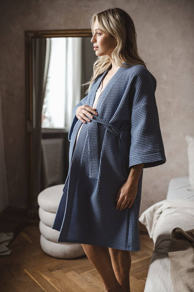 Szlafrok został zaprojektowany z myślą o mamach, dlatego jest nieco dłuższy, abyś spokojnie okryła nim ciążowy brzuszek. Po porodzie bez skrępowania b będziesz mogła spacerować po szpitalnym korytarzu lub na leżąco nakarmiła maluszka w połogu. Posiada kieszenie na niezbędne drobiazgi i pasek do regulowania szerokości.