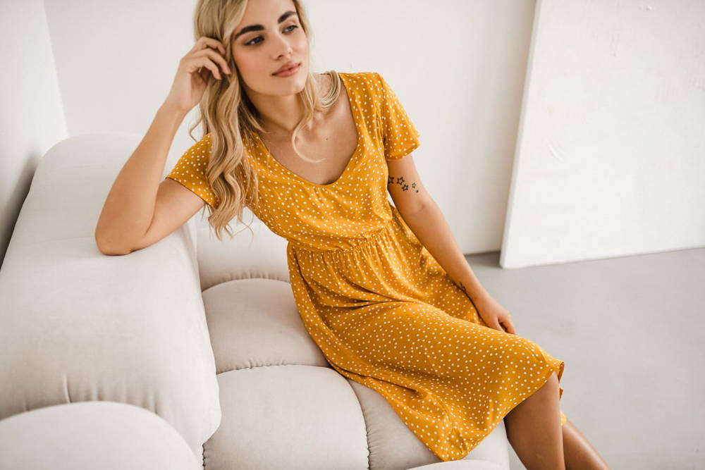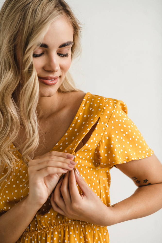 Lovely Dress Midi sukienka ciążowa i do karmienia krótki rękaw Milk&Love musztardowy w groszki