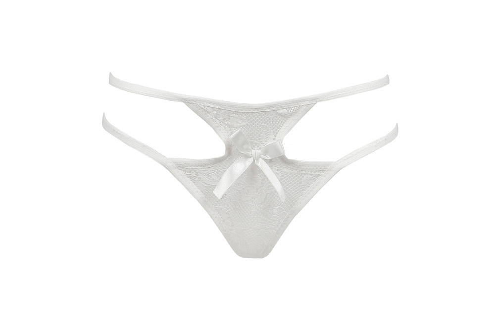Sexy tanga z průhledné krajky. Ozdobná mašle uprostřed.
